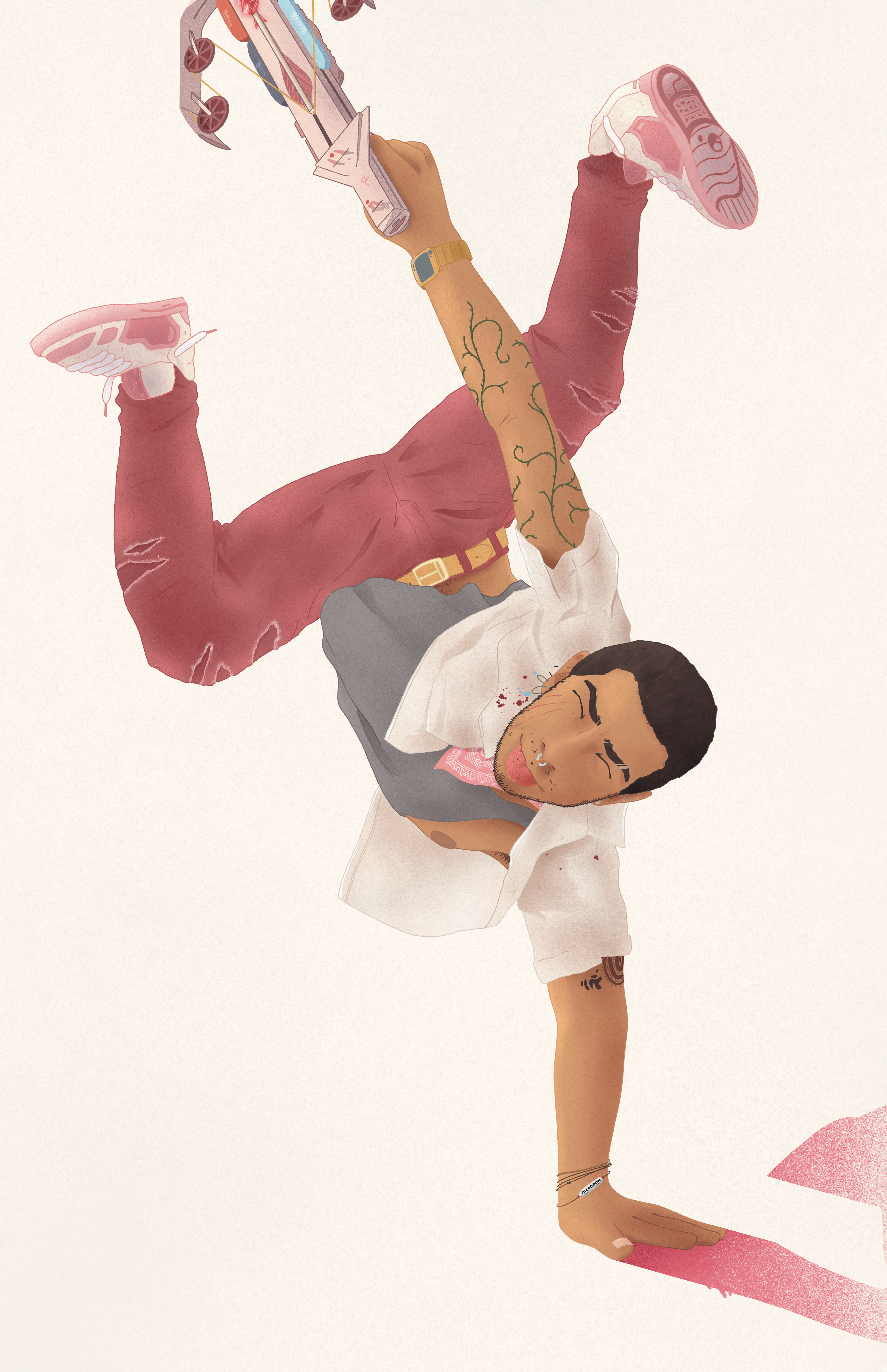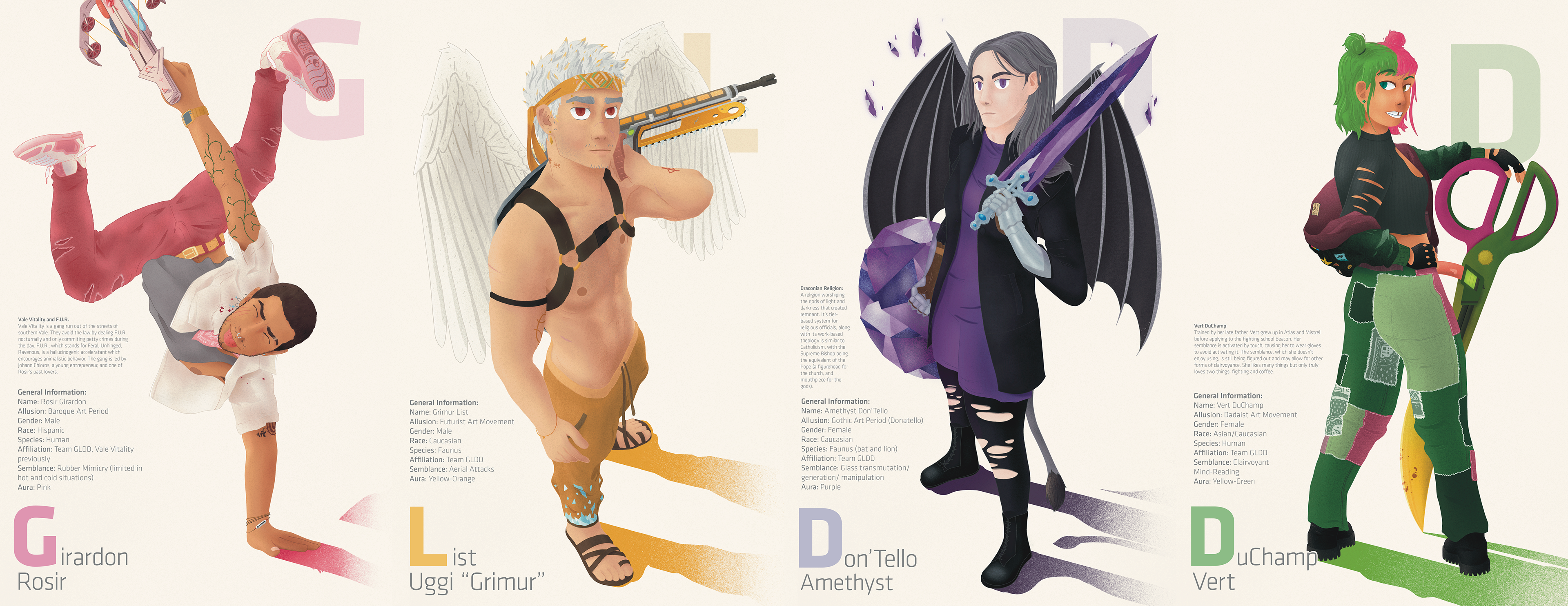 Based on characters my friends and I had created years back, I brought to life a diverse cast of characters that each offer allusions to art movements of the past. Each character is linked to a color: pink, orange, purple, and green, which was an interesting challenge.
