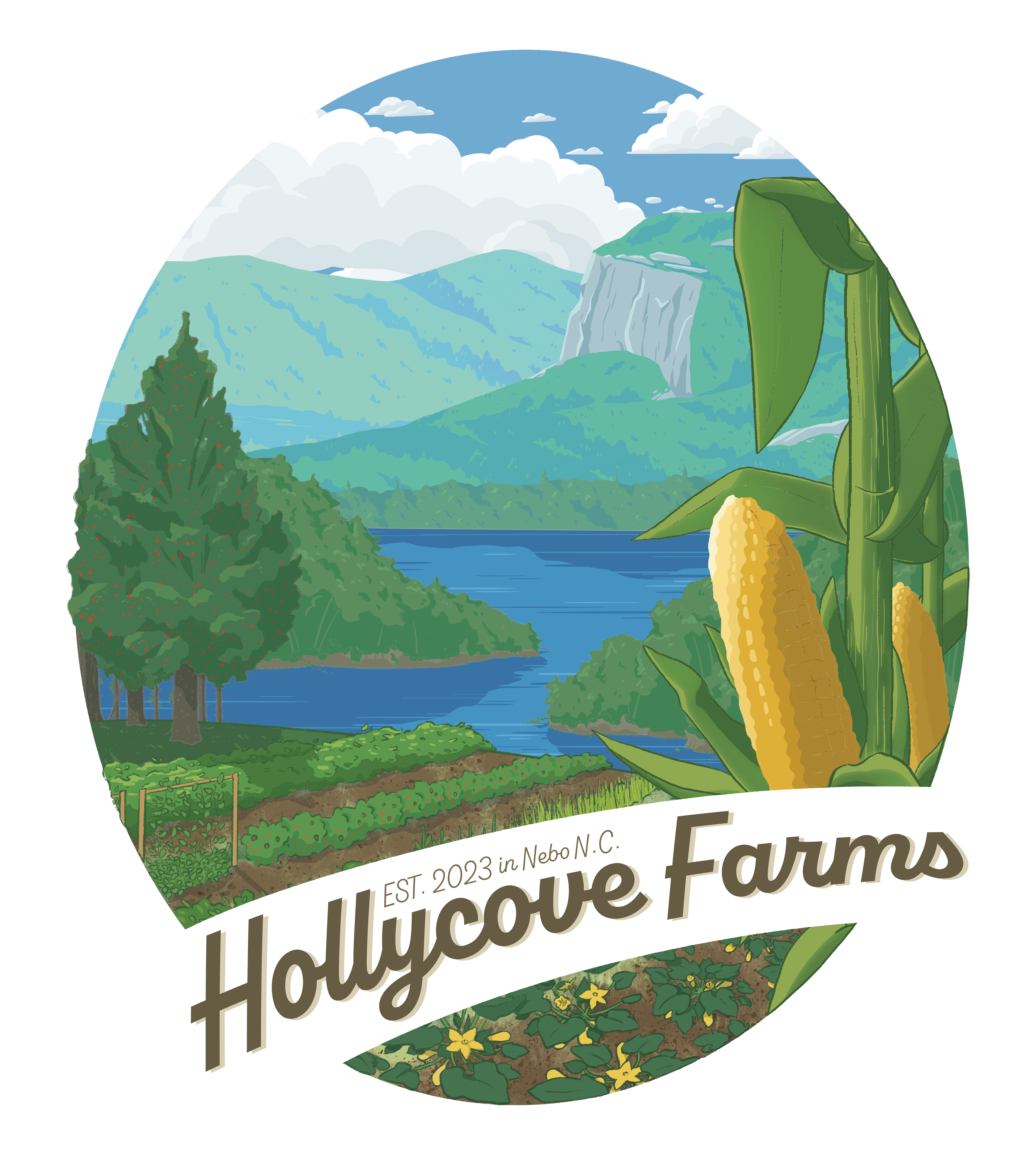 Hollycove Farms, a local farm run out of rural western North Carolina, commissioned me to produce a logo for their up-and-coming farm. The logo features a farm landscape in front of a local landmark: Shortoff Mountain.