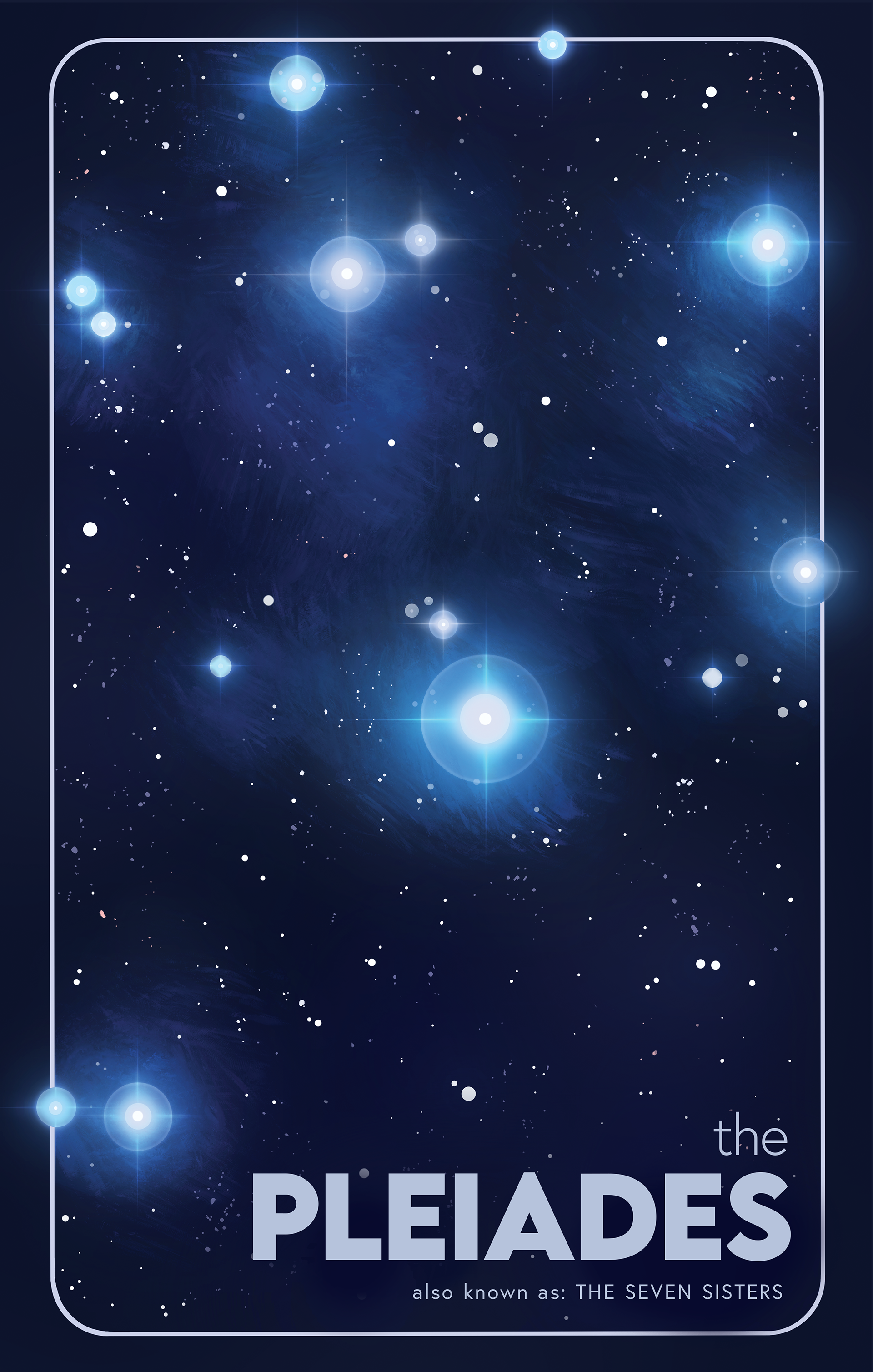 This poster was first inspired by the dawn of the Pleiades' reign in the winter night sky and an article my aunt sent me regarding the star cluster. I've been drawn to the stars for a long time for their beauty and compact design and wanted to continue making art in a similar style to my Celestia poster.