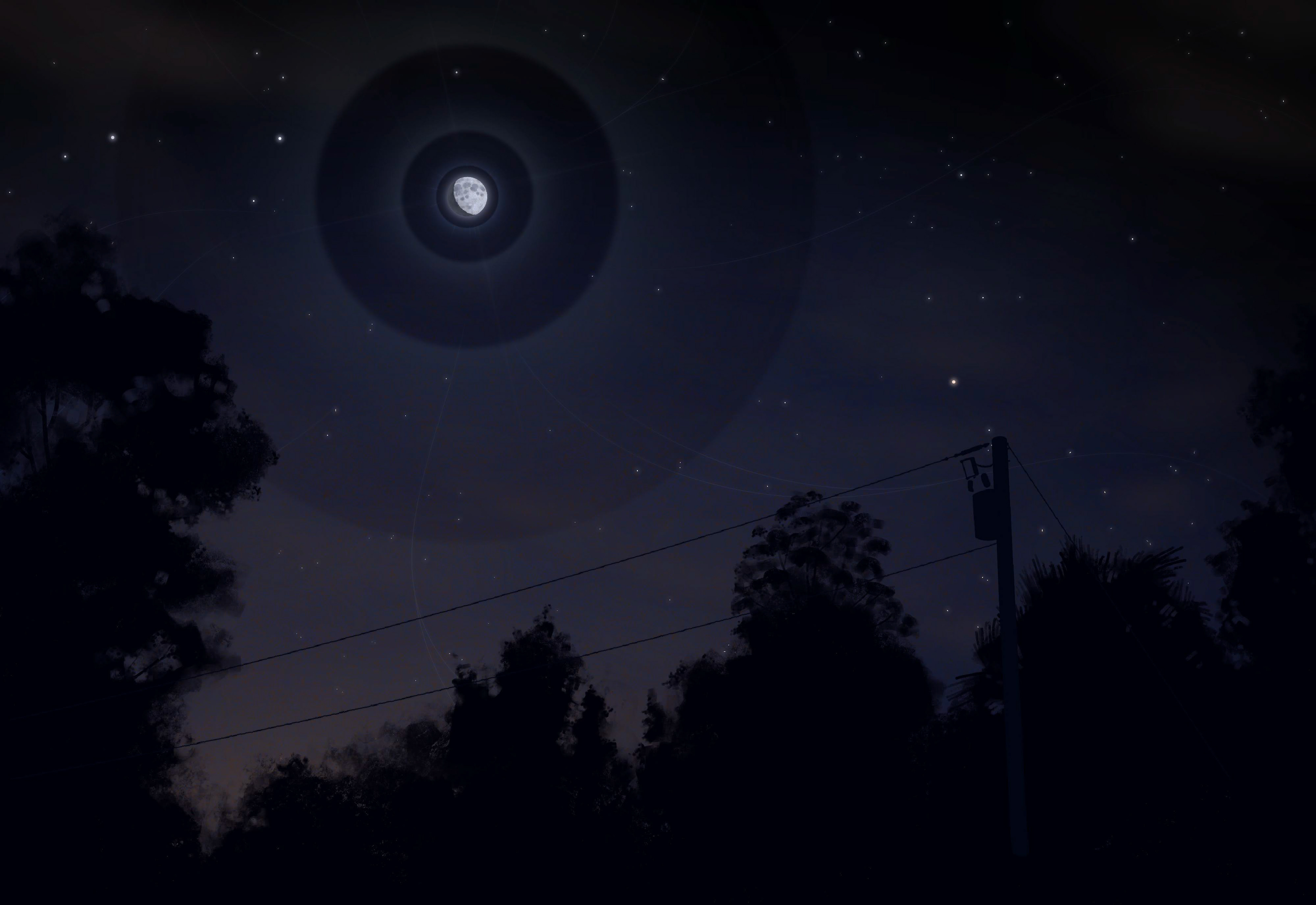 Inspired by my time stargazing from outside my front step, this piece captures my perspective of viewing the moon and stars during warm nights in Florida. The constellations Scorpio and Bootes are visible in this piece, Scorpio being left of the moon, and Bootes' most prominent star, Arcturus being visible off to the right by the powerlines.